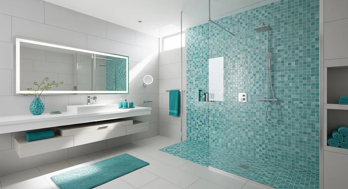 La mosaïque adhésive est l'autre valeur sûre. En petits carreaux, elle épouse les formes et donne du caractère à une cabine standard. Les motifs géométriques ou les dégradés de bleu rappellent les douches d'hôtels design.